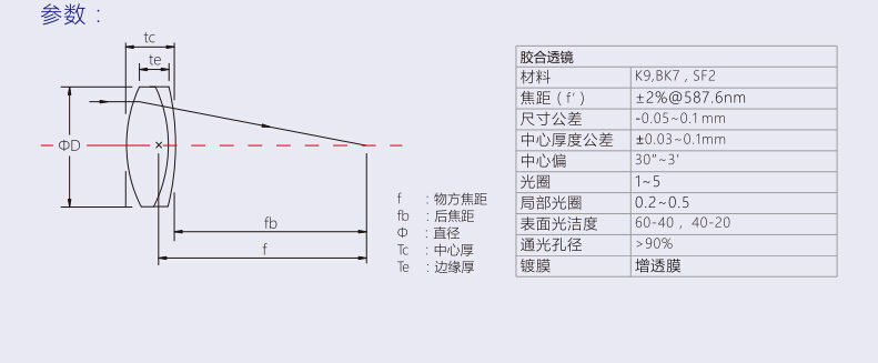 膠合透鏡也叫消色差透鏡,是由兩個(gè)單片鏡片通過(guò)膠合而成,在復(fù)色(白光)成像的性能比單透鏡性能提高了許多。消色差鏡片由兩片材料不同的鏡片膠合在一起,校正了玻璃的色散。